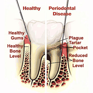 Untreated gingivitis can advance to periodontitis. With time, plaque hardens to form tartar and begins to grow below the gum line detaching the gums from tooth. Toxins produced by the bacteria in plaque stimulate a chronic inflammatory response causing bone resorption. Gums separate from teeth, forming pockets (spaces between the teeth and gums) that become infected. As the disease progresses, the pockets deepen and more gum tissue and bone are destroyed. Often, this destructive process has very mild symptoms. Symptoms include bleeding gums, bad taste in the mouth, halitosis (bad mouth odor) and in severe cases abcesses. Eventually, teeth can become loose and may have to be removed.